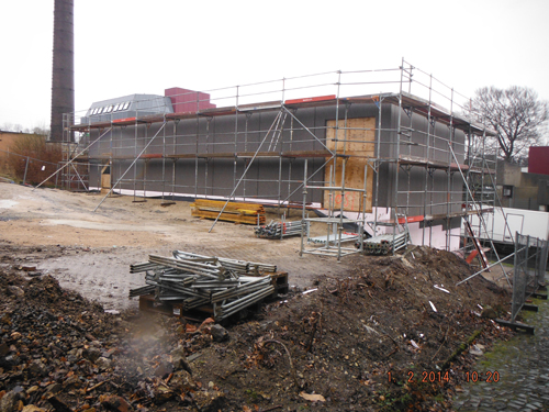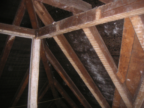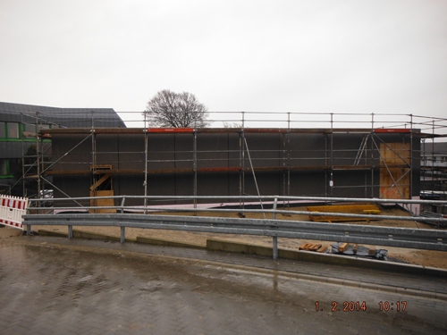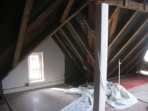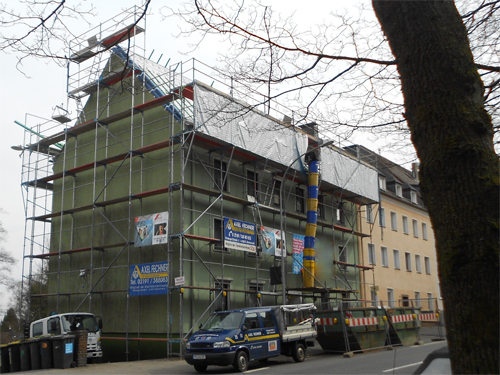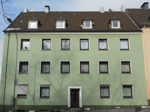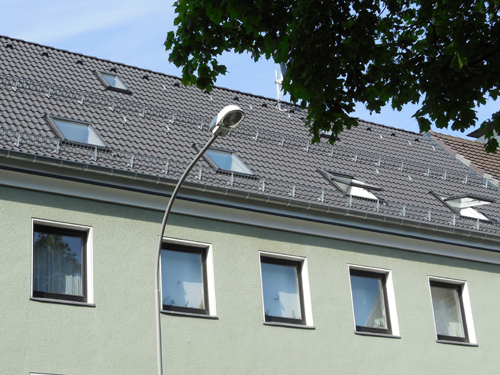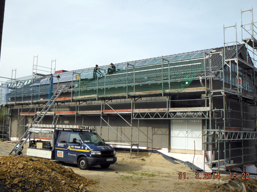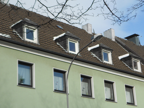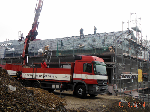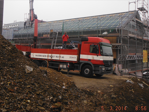 Abbruch der Dacheindeckung bis auf die Dachsparren. Nicht genutzte Schornsteine bis unter Dach abgetragen. Aus wirtschaftlichen und energetischen Gründen wurden die Dachhäuschen- Aufbauten abgetragen und durch passende Wohndachfenster mit besserem Lichteinfall ersetzt. Einbau einer Dampfbremse oberhalb der Dachsparren einschließlich luftdichter Anschlüsse an der vorhandenen Gebäudehülle.