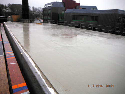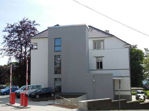 Dachstuhl, Mineralfaserdämmung, Dacheindeckung Betondachsteine Brass Harzer Pfanne 7 (Big) Novo Matt Granit, Entwässerungsrinne und Rohre aus RHEINZINK walzblank, Sicherheitshaken und Schneefangsystem als Gitter feuerverzinkt, Giebelverkleidung Stehfalz RHEINZINK vorbewittert.