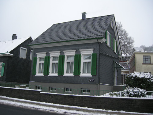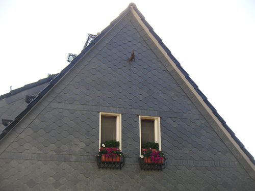 Dachrinnen in Zink, wegen des Klimawandels mit häufigem Starkregen wurden anstatt einer 6 tlg. Rinne (333 mm), eine größere 5 tlg. Rinne (400 mm) angebracht. Schneefang- System feuerverzinkt Top mit zwei Auflagepunkten für bessere Standfestigkeit,optimiert durch ein zweites Schneefang- System mittig über den Wohnraumdachfenstern