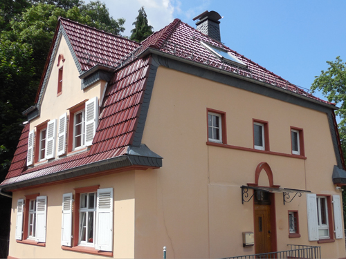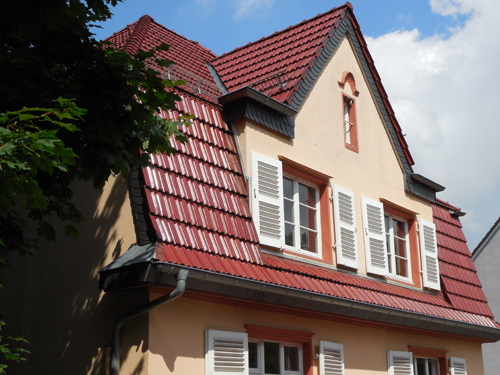 Dacheindeckung Ton Dachziegel Granat Seidenmatt (Glasur) Kastanie. Wohndachfenster in groß für besten Lichteinfall. Dachrinnen in Zink.
